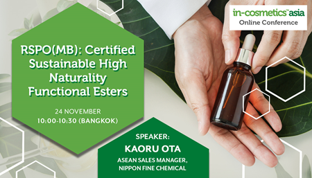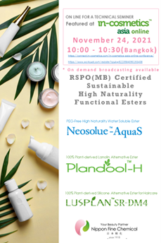 「In-cosmetics Asia 2021」において、当社のRSPO認証(MB)を得ている製品に関するWebinarを行います。