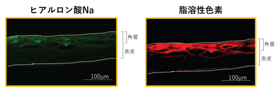 【試験方法】脂溶性色素と蛍光標識したヒアルロン酸Na(分子量10〜30万)を配合した
